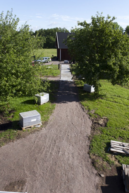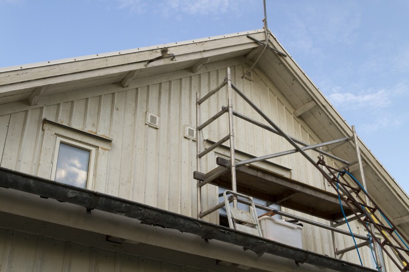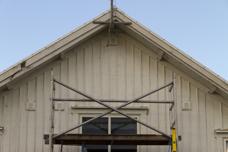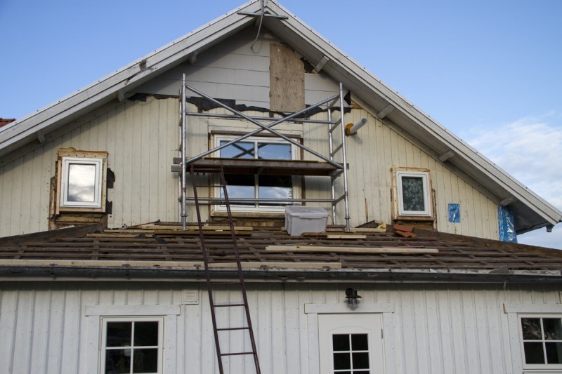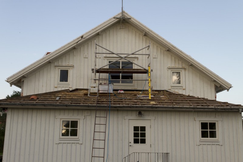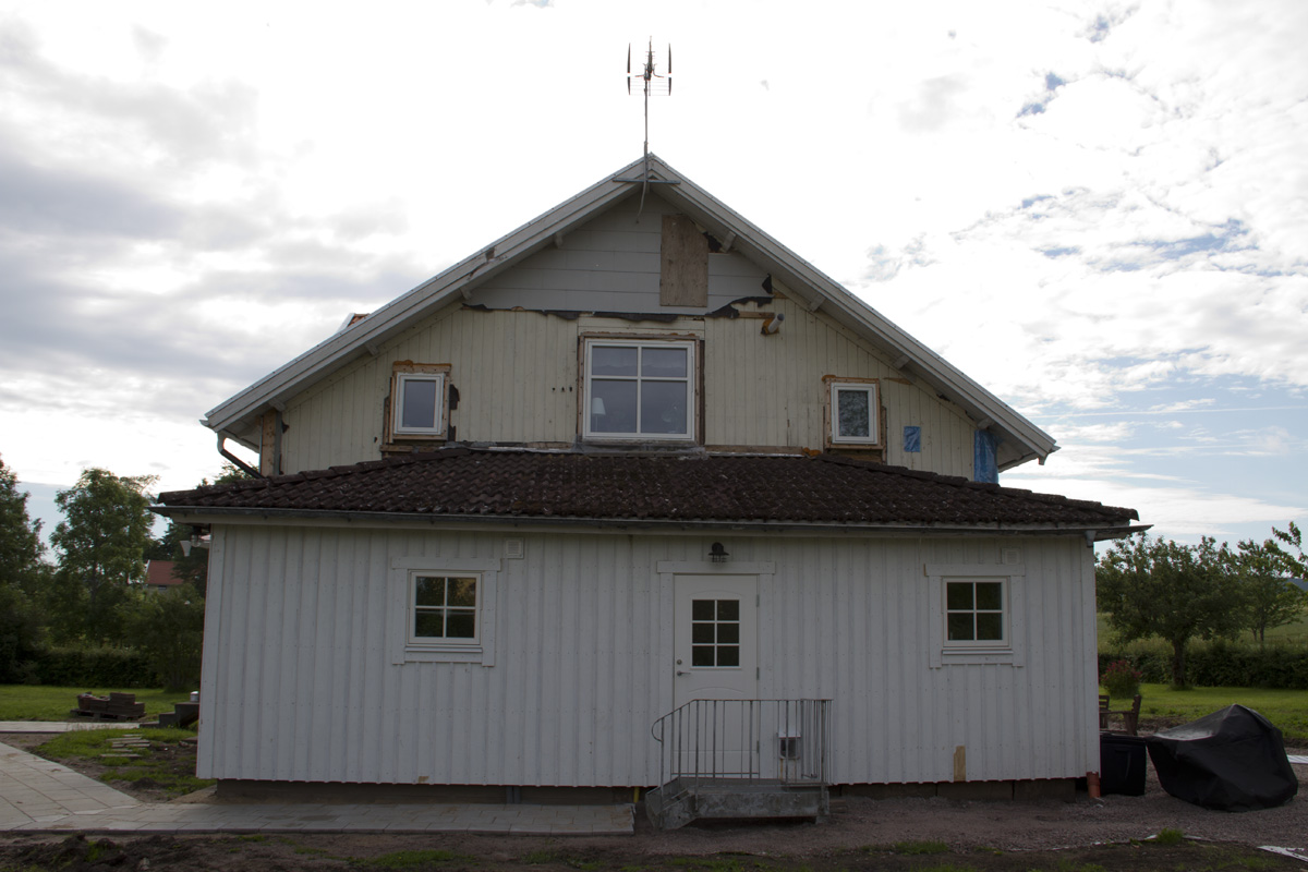 Nu rullar det på och börjar synas vart vi är på väg. Idag har vi satt foder kring fönstren och börjat att läkta väggen. Tyvärr tog läkten slut så vi får beställa ny imorgon av vår lokala hjälte Assar. Imorgon ska jag måla den högsta delen av väggen så att vi kan ta ner ställningen. Vi ska även ta ner de gamla vindskivorna snyggt så att vi enkelt kan göra nya kopior av dessa. Slutligen ska vi riva bort läkt och massonit från taket så att vi kan börja på ny kula där. Känns som att det kan bli en lång dag imorgon, men det är helt okej nu när allt rullar på som det ska.